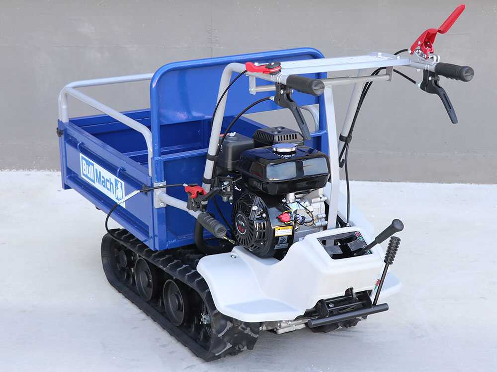 Die Ladefläche dieser Motor-Schubkarre ist ausziehbar und ermöglicht, die Tragkraft dieser Maschine erheblich zu erhöhen. Ein weiterer großer Vorteil ist die Ausstattung mit zusätzlichen abnehmbaren Seitenwänden, die einen besonders vielseitigen Einsatz ermöglicht. Weitere Eigenschaften dieser Schubkarre sind die Raupen, die eine sehr hohe Sicherheit und Stabilität während der Benutzung der Maschine selbst mit einer schweren Last und bei Steigungen garantieren, die die üblichen Motorschubkarren nicht fahren können. Der robuste Stahlrahmen und das Getriebe mit 6 Vorwärtsgängen und 1 Rückwärtsgang machen diese Motorschubkarre vielseitig und leistungsfähig.
