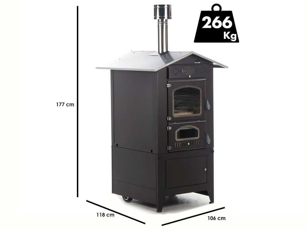 In seinem 60×50 cm großen Garraum können Sie Brot bis zur Pizza, Fleisch oder Kuchen mehrere Gerichte auf einmal zubereiten. Der Ofen ist mit einer isolierten Brennkammer ausgestattet, um den Holzverbrauch zu reduzieren und die Umgebung sauber und rauchfrei zu halten.