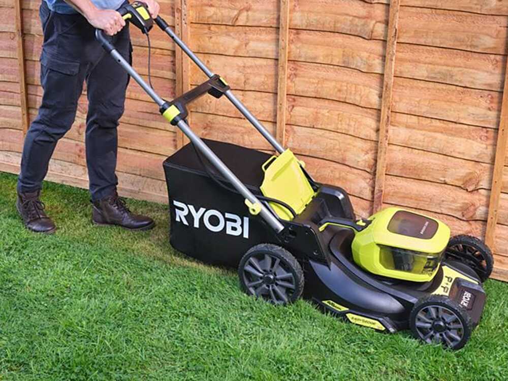 Der Teleskopstiel ist höhenverstellbar und lässt sich zur platzsparenden Lagerung vertikal einklappen. Der Rasenmäher ist Teil des ONE-Systems: Die mitgelieferten Akkus und das Ladegerät sind mit anderen Ryobi-Geräten aus dem Sortiment kompatibel.