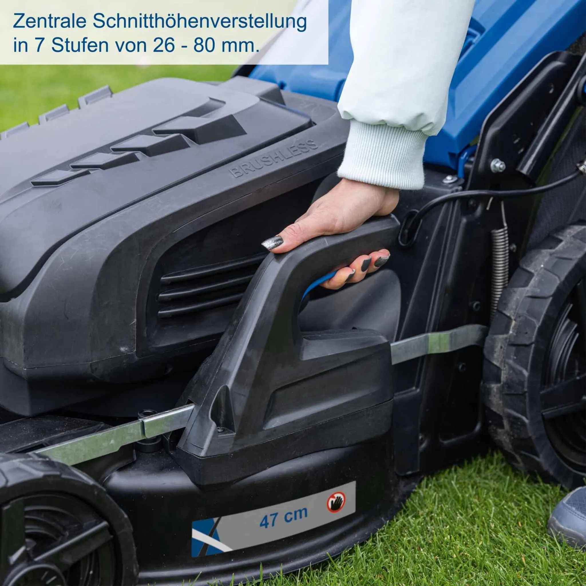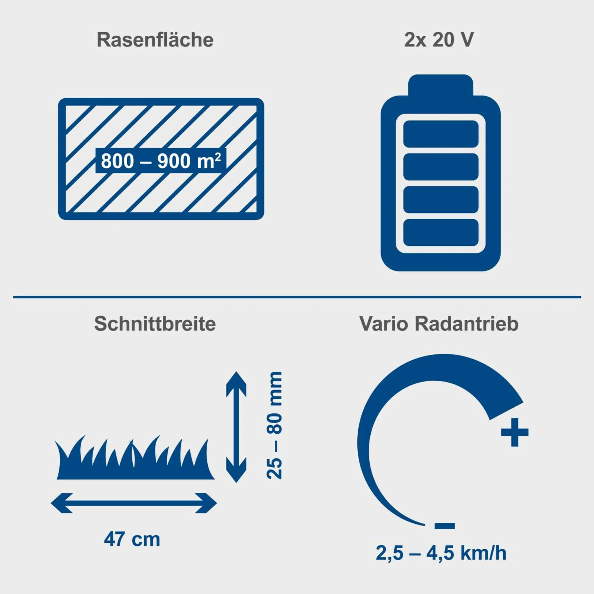 Leistungsstarker Akku-Rasenmäher mit 47 cm Schnittbreite für Gärten mit 800 – 900 m2