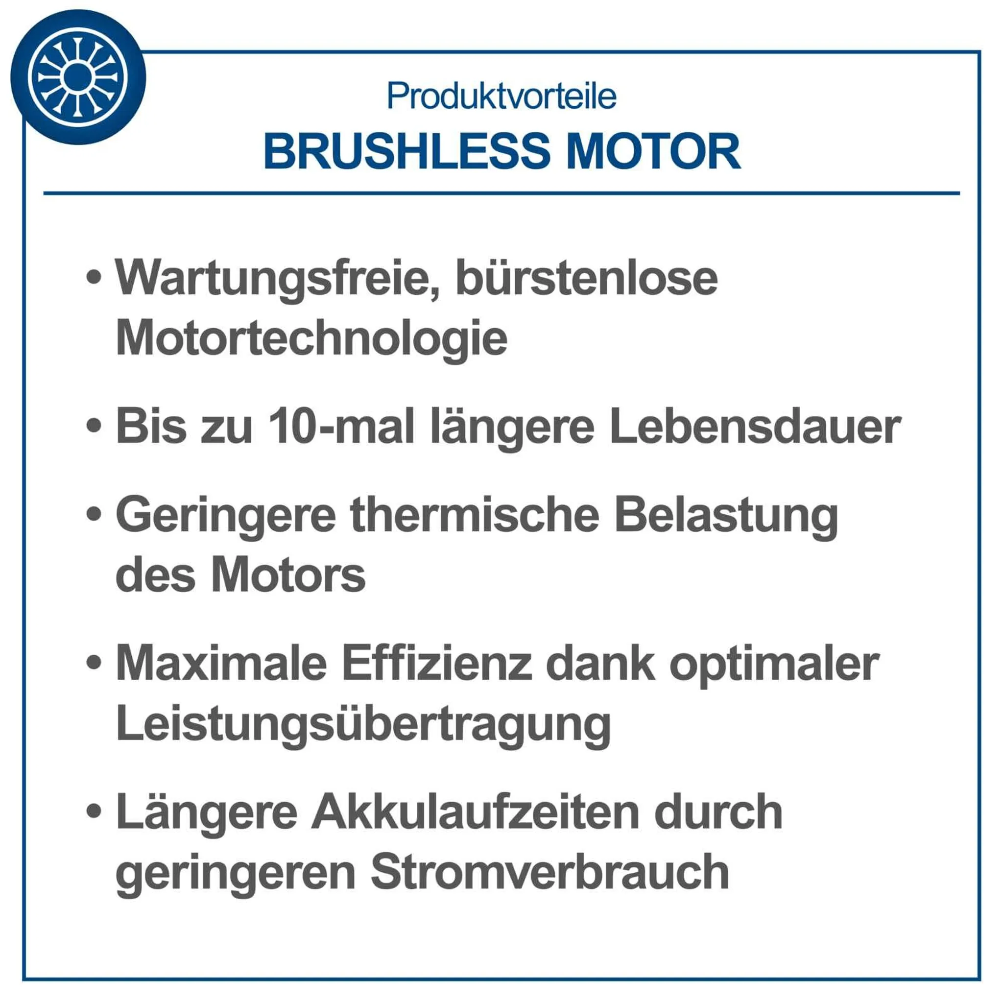 Wartungsfreier, bürstenloser Motor (Brushless Motor) mit besonders hohem Wirkungsgrad, längerer Laufzeit, hoher Lebensdauer und geringem Verschleiß