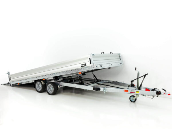 • Kippbare Ladefläche: Der Anhänger verfügt über eine kippbare Ladefläche, die ca. 13,5° neigt. Die Kippung erfolgt über eine einfachwirkende manuelle Pumpe, was das Entladen erleichtert.