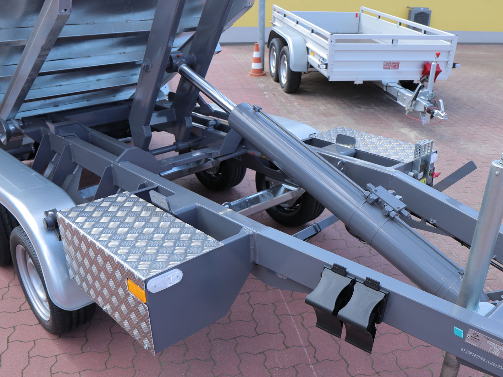 Der Vezeko KONOS Abroll-Muldenkipper 3,5t bietet eine vielseitige Lösung für den Transport von Materialien und Abfall. Ausgestattet mit einem robusten Hakengerät und einer 40 cm hohen Kippmulde eignet sich dieser Anhänger ideal für den Einsatz in Bau- und Entsorgungsbereichen. Die Bedienung erfolgt bequem über eine Funkfernbedienung.